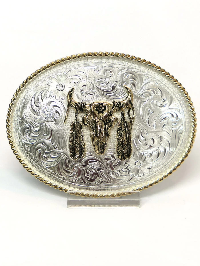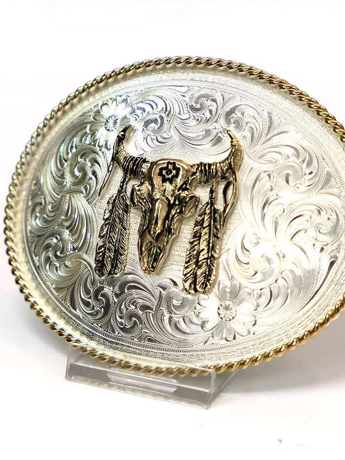 Montana Silversmiths 1350-447 Buffalo Skull With Feather Belt Buckle Silver -Medium sized oval silver western belt buckle with polished gold twisted rope trim. Buffalo skull with feather figure in the center stippling background framed all around with authentic western silver engraving filigree, accented with two flowers at the top right and bottom left. Standard 1.5 inch belt swivel.