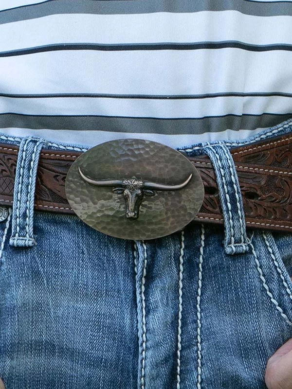 Montana Silversmiths 40510CBB-767M Vintage Bronze Cascade Longhorn Oval Buckle – Beautifully simple, this vintage bronze finished oval buckle has a lightly hammered texture to its surface, the dimpling creating a rippling water effect. A large detailed longhorn figure is applied to the center of the buckle. Each buckle is hand-buffed giving every buckle a variation of its own. Longhorn finish color can range from a light gold tone to a deep vintage bronze. Standard 1.5 inch belt swivel.