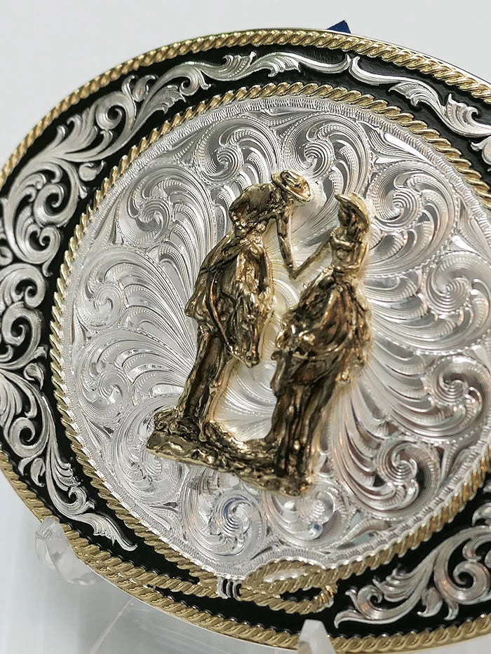 Montana Silversmiths 6190-101223 Two Trails Buckle – At the center of our “Two Trails Buckle” features an antiqued gold finished figure of your choice that fits. A gold finished rope lassos from the outside of the buckle inwards to frame the scene and contains a silver and black finish in classic old West billfold patterns. Perfect for church on Sundays or rodeos, this Montana Silversmiths’ buckle is one of a kind. Standard 1.5 inch belt swivel.