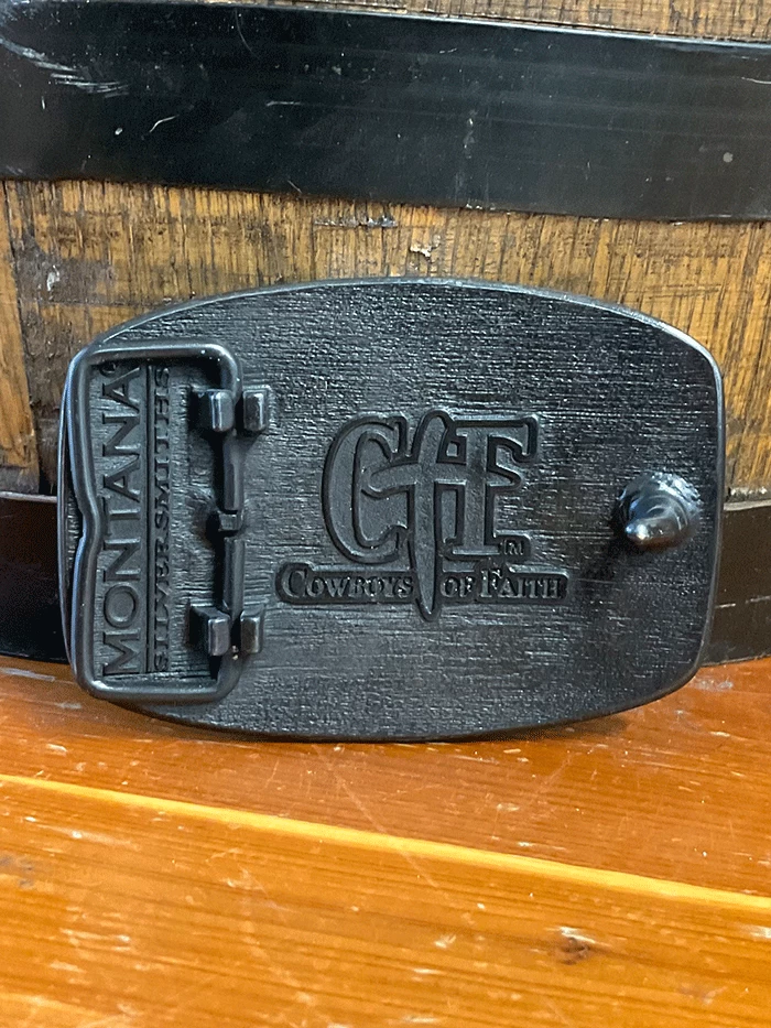 Montana Silversmiths A706C Cowboys of Faith Flag Buckle Brass – An antiqued brass Attitude buckle with the Cowboys of Faith® figure against a flag background with a rope trim edge. 1.5 swivel.