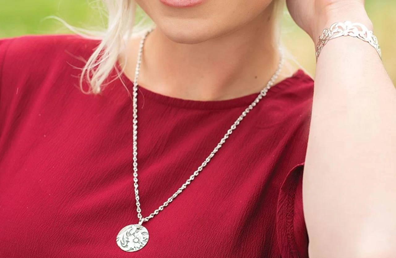 This beautiful, Western, antiqued silver finished necklace features floral filigree that you would find on the best leather work. This Montana Silversmiths necklace is great to wear around as an everyday piece to symbolize your love for the western lifestyle. Made in Columbus, Montana. The round pendant hangs on a 22 inch adjustable chain.