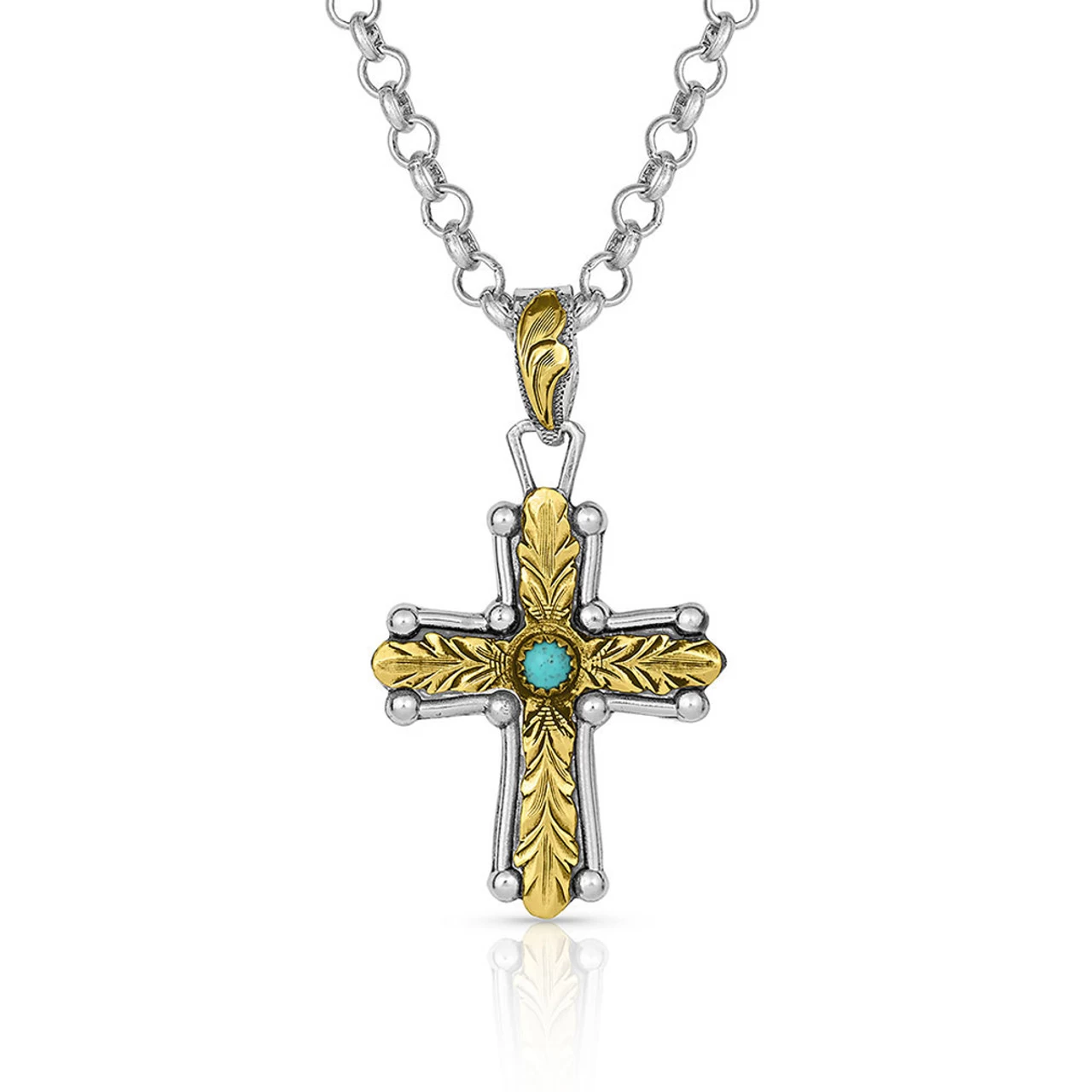The perfect arrangement – if we don’t say! At the Center of Faith Cross Necklaces hangs from a 28″ silver-finished chain. It holds a cross that is designed to showcase the mix of gold-tones on top of silver-tones. This cross begins with two gold-finished feathers that are in the shape of a cross. The feathers are etched with the tiniest strokes and showcases true craftsmanship. In the center of the feathers, gold-finished cross holds a turquoise stud. A silver-toned frame is stamped around the entire shape to bind together everything under faith.