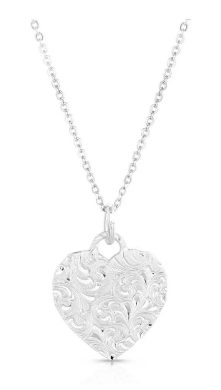 This pendant necklace features a chiseled heart reproduced in a bright silver tone. A center stone of compressed turquoise and copper creates a dramatic focal point on this unique necklace for color and interest. The Chiseled Heart Necklace is secured by a 19 inch silver tone chain. This pretty necklace is an easy way to show your love and extend that joy and warmth to everyone around you. Stone color will vary.