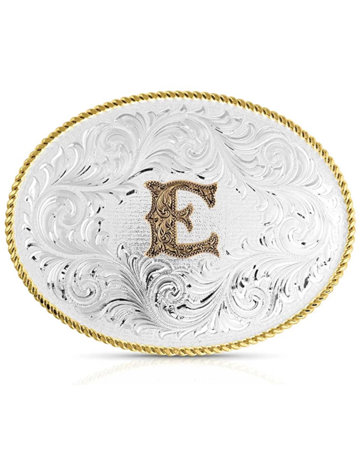 - Silver-toned oval buckle with gold roped border and “E” on front with silver-toned filigree details