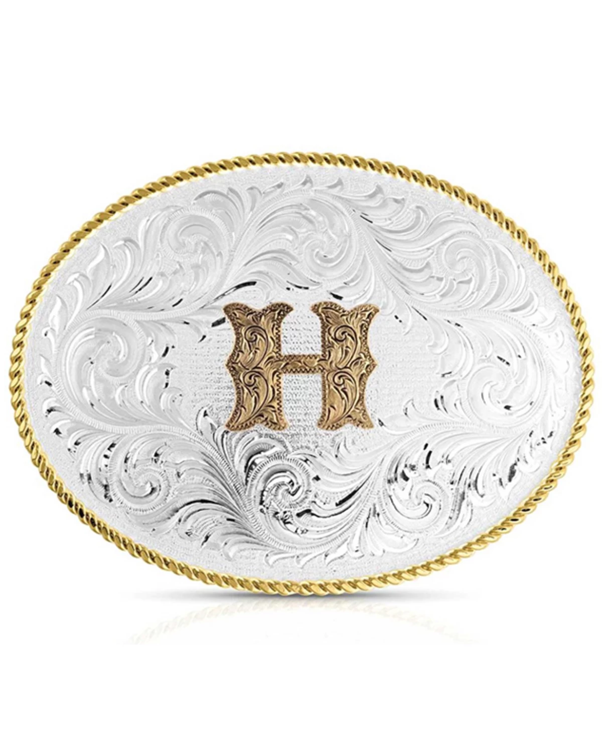 - Silver-toned oval buckle with gold roped border and “H” on front with silver-toned filigree details