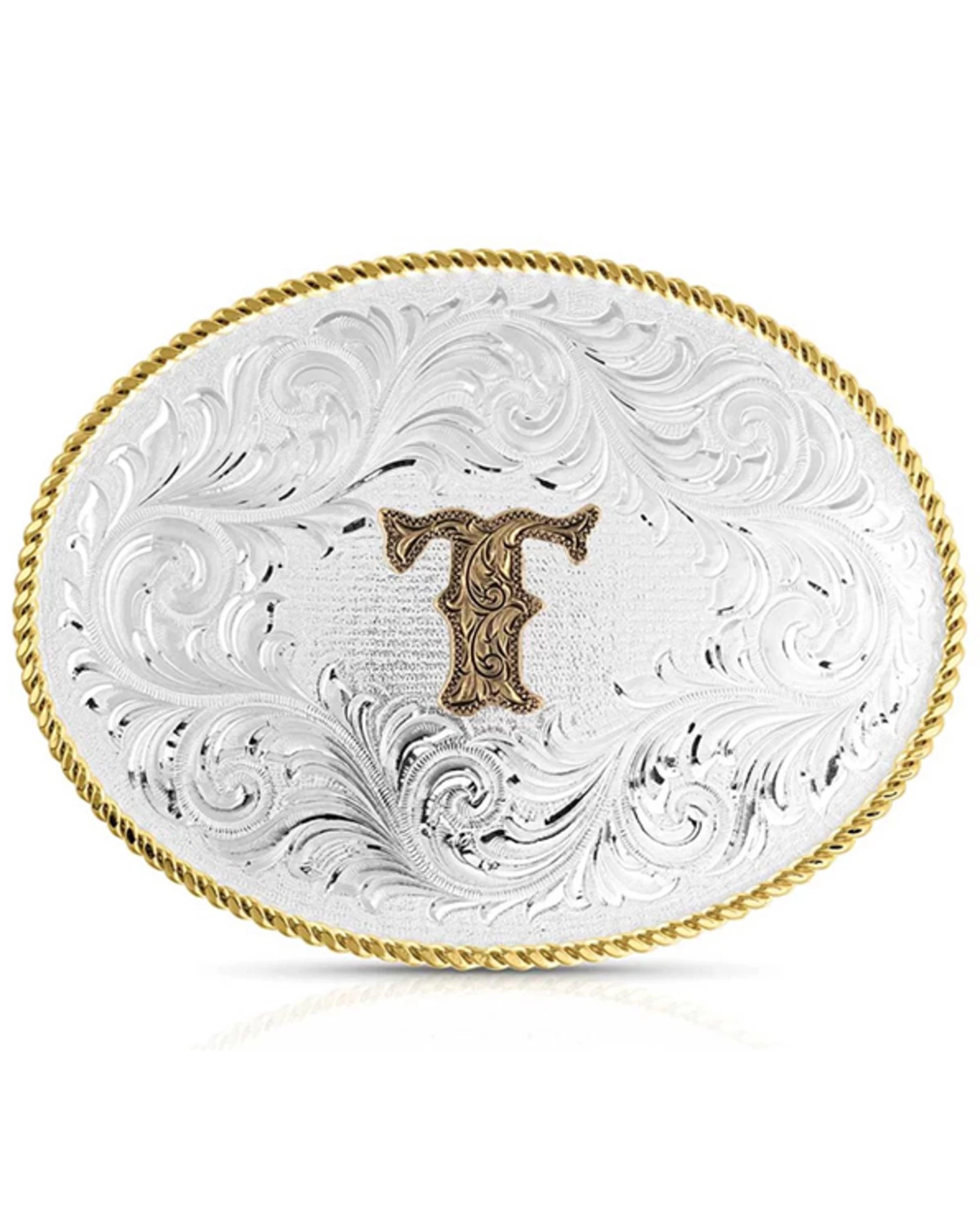 - Silver-toned oval buckle with gold roped border and “T” on front with silver-toned filigree details