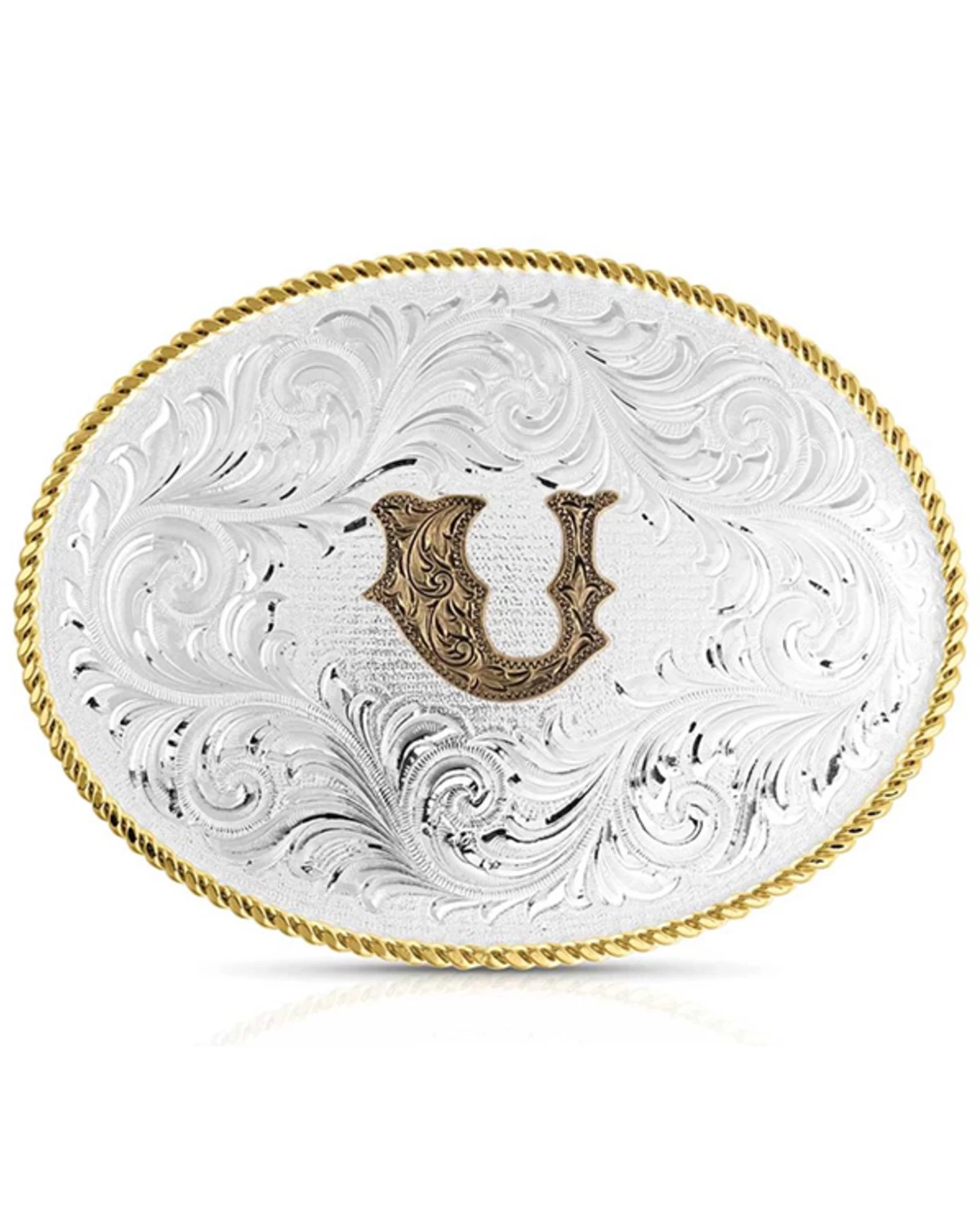- Silver-toned oval buckle with gold roped border and “U” on front with silver-toned filigree details