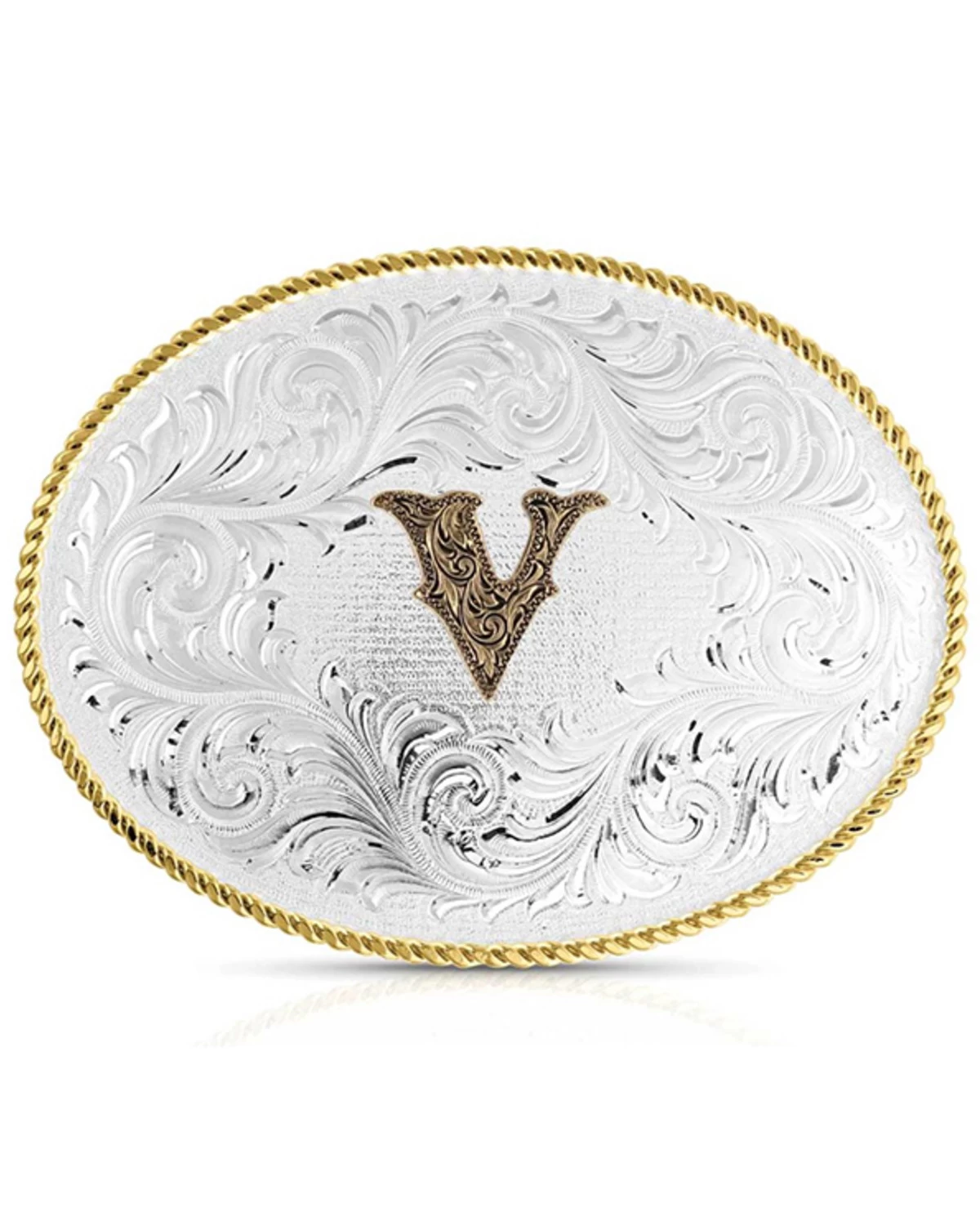 - Silver-toned oval buckle with gold roped border and “V” on front with silver-toned filigree details