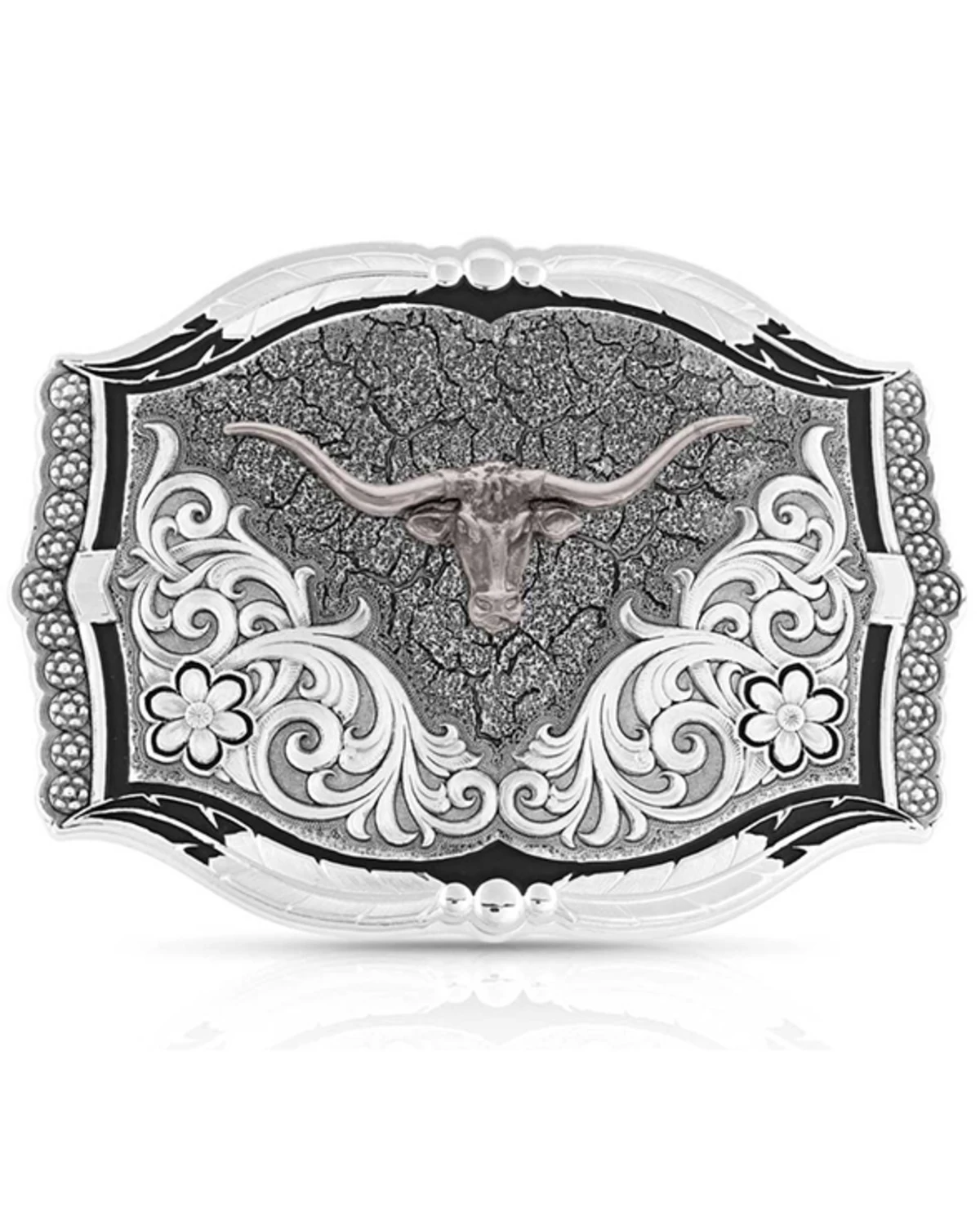 - Silver finished filigree emits from flowers in bottom corners