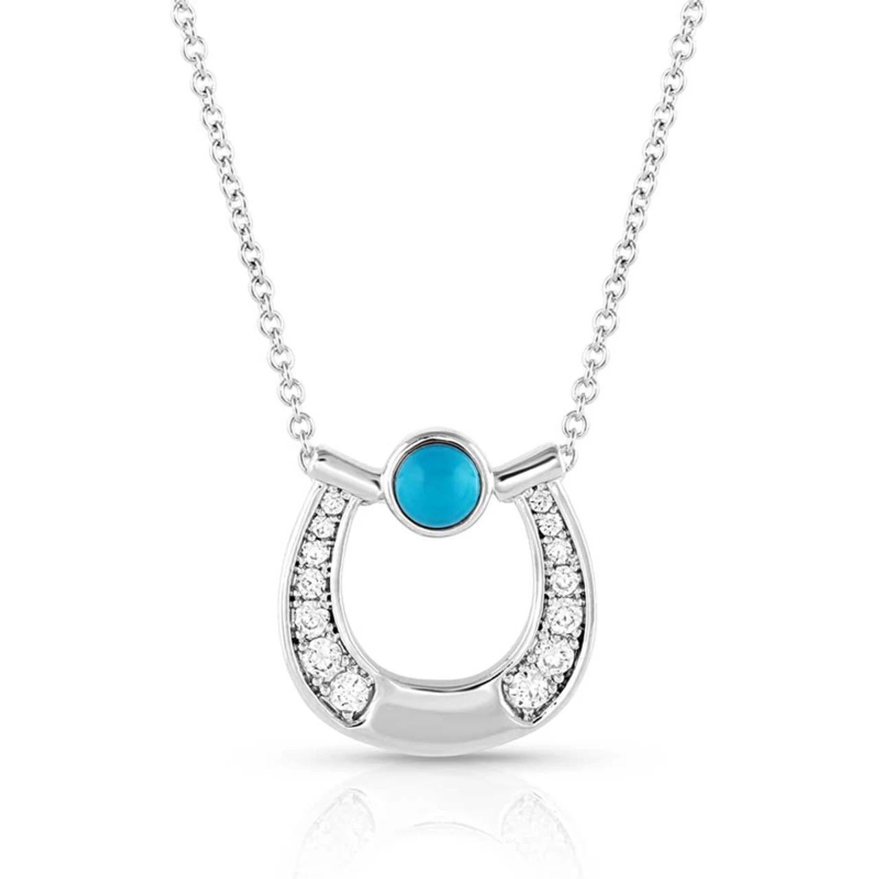 Materials: Rhodium over brass. Cubic Zirconia. Synthetic Turquoise. Rhodium over brass chain.