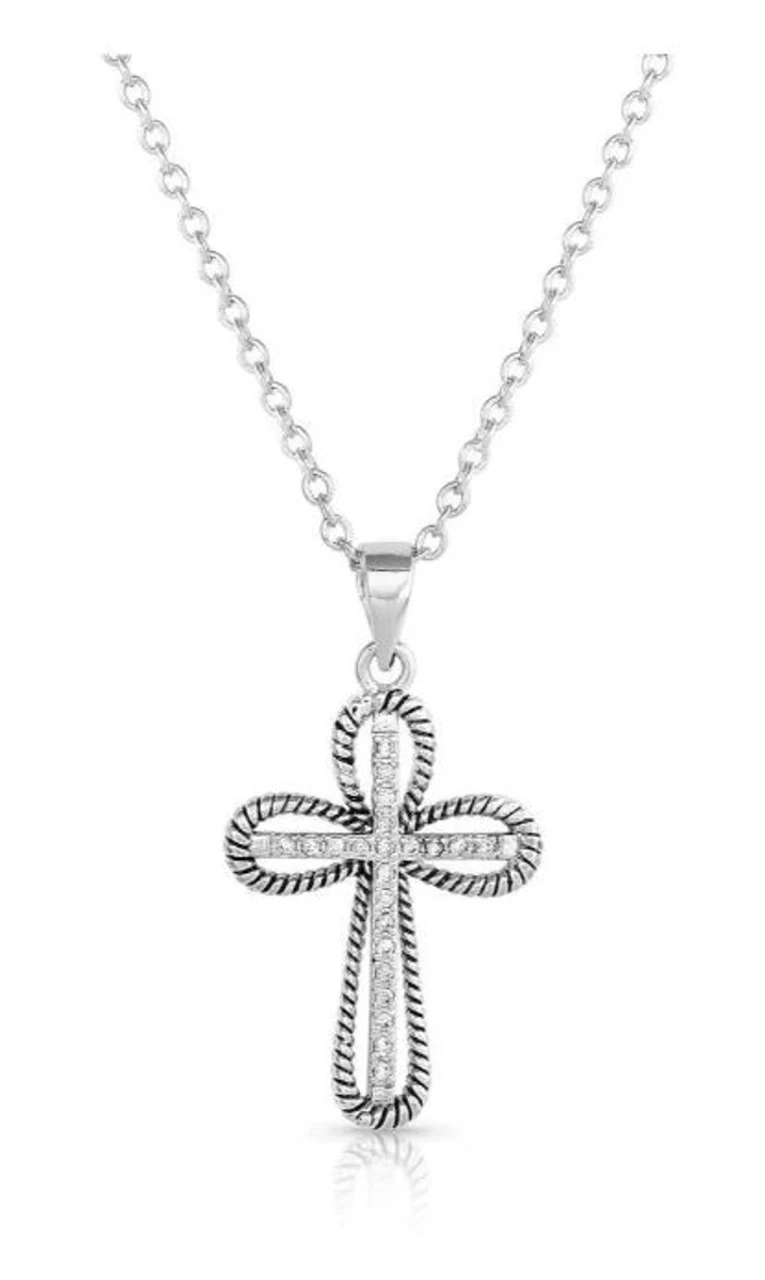 A lovely way to show your beliefs, our Expressive Faith Crystal Cross Necklace is made of a gorgeous silver-tone with western-style roping and sparkling clear cubic zirconia crystals. The clear cubic zirconia crystals create the center cross and silver tone twisted rope creates a larger cross around the center. Their graceful shape and elegant design make them right for any occasion from the trail or pasture to Sunday morning worship. Simply styled this 19 inch silver tone necklace can be worn to share your faith everywhere you go.