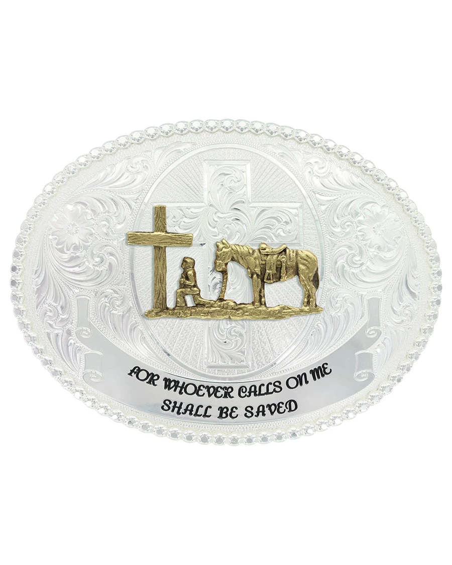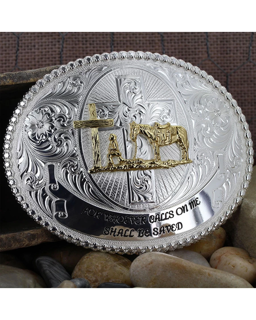 - Detailed silver cross in the center and a gold Christian cowboy figure in center of buckle