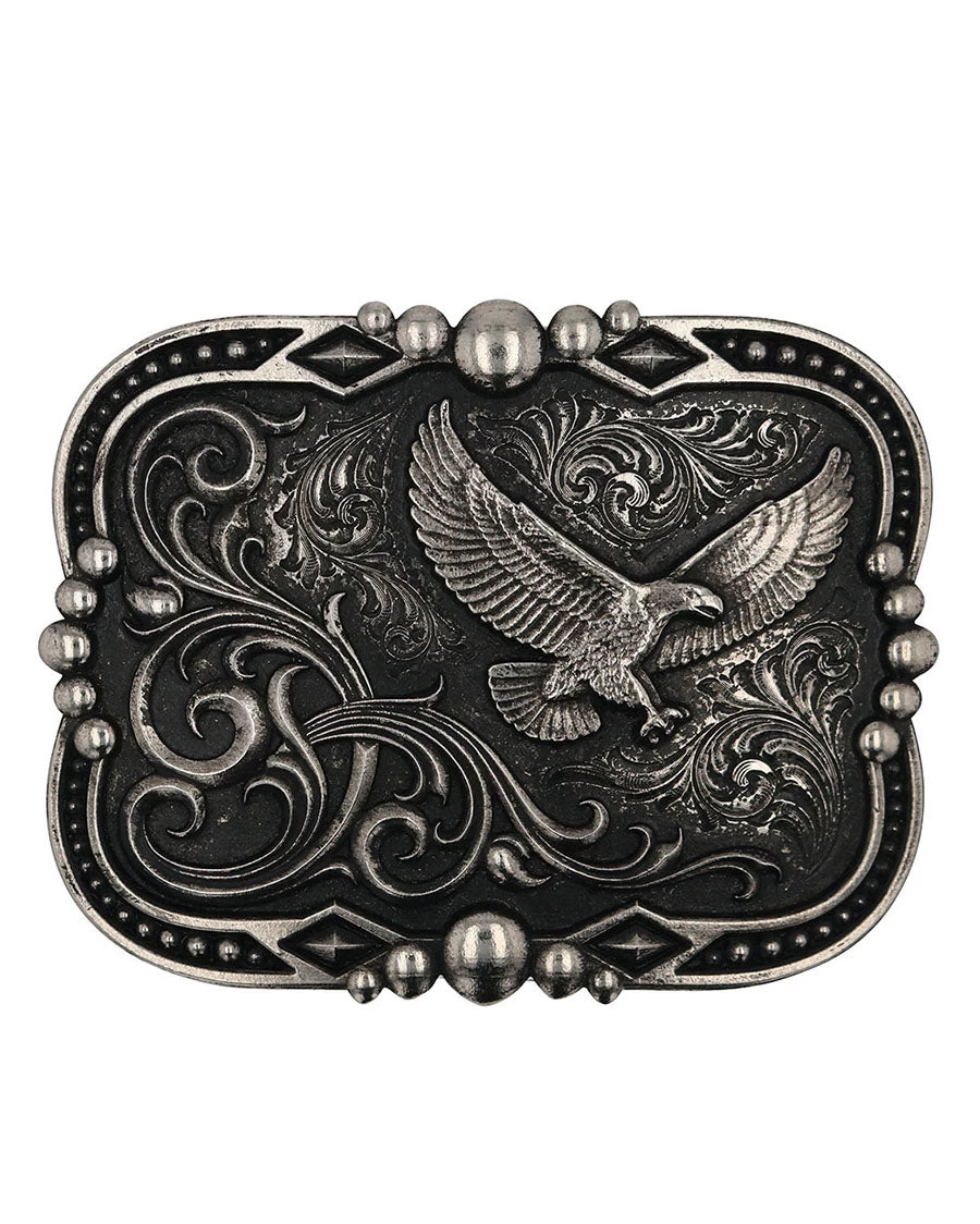 Attitude belt buckle in a scalloped shape and silver finish. It includes an eagle and studded details.
