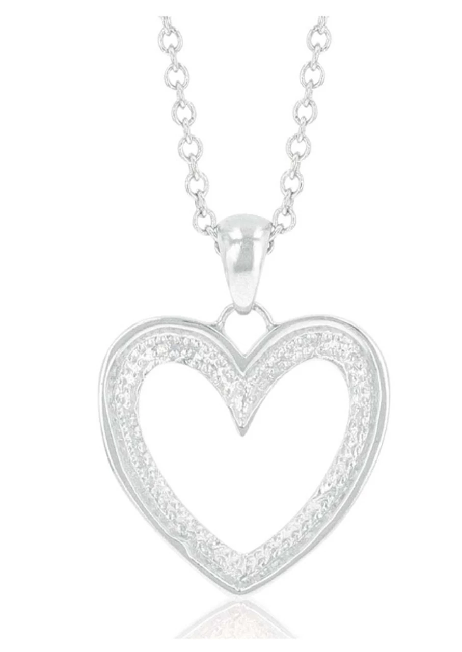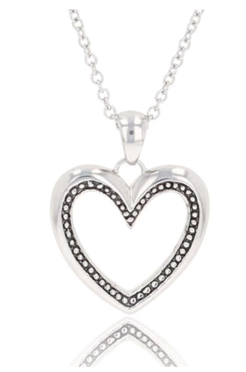 A classic heart shaped center with an open center. This silver toned has a lightly antiqued microbead inner edge that looks like a silver stitched thread against a darker fabric. A smooth bright silver out edge finishes off the heart shape. A smooth silver toned bail attaches the silver heart pendant to a princess length, 19 inch chain.
