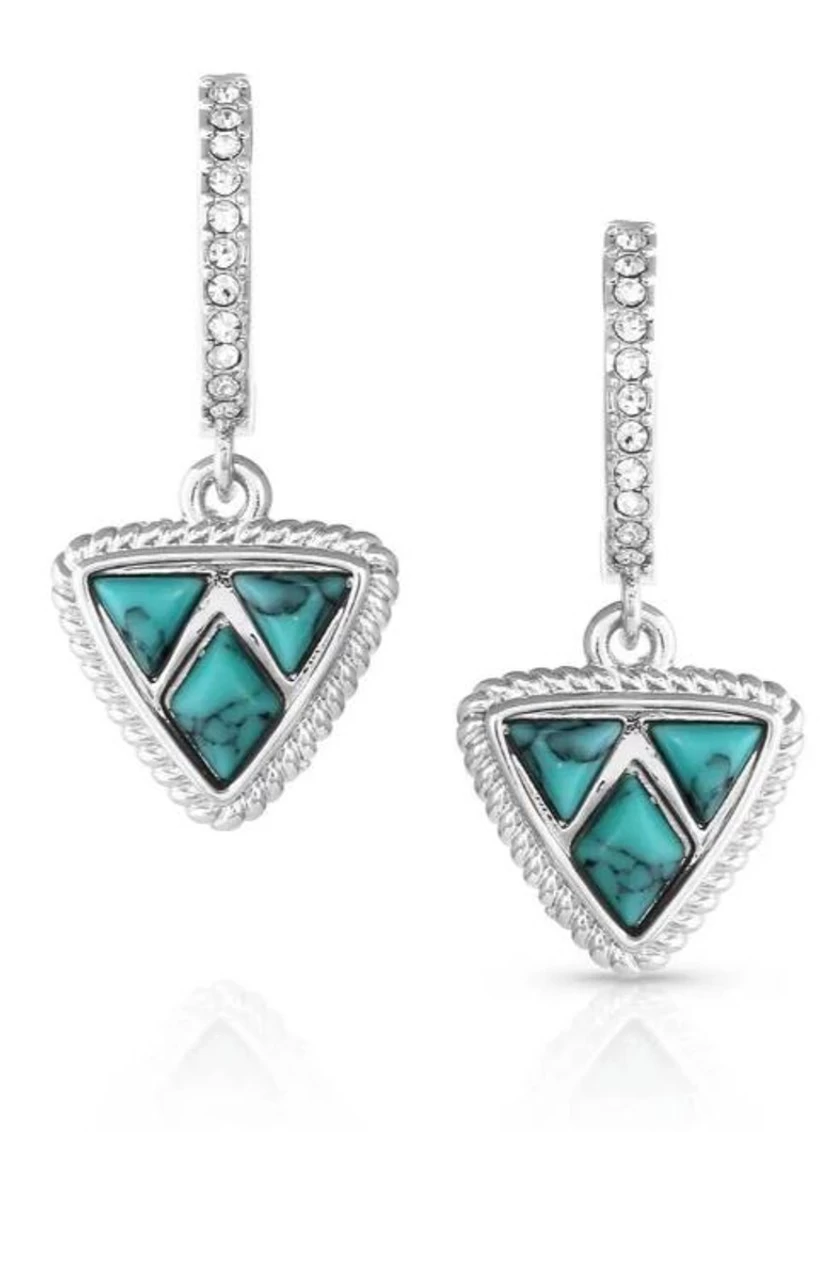 Fall in love with these stunning silver tone, crystal, and turquoise earrings. The beautiful shape and design are sure to lend a unique touch to any outfit. The triangle shape is accented with silver finished roping around the edges and filled with a beautiful cobblestone design of turquoise stones. Secured by a hinged back that features small cubic zirconia crystals that lead to the dangling earrings. Pair these lovely earrings with the matching High Noon Cobblestone Turquoise Necklace for a polished and sophisticated look.
