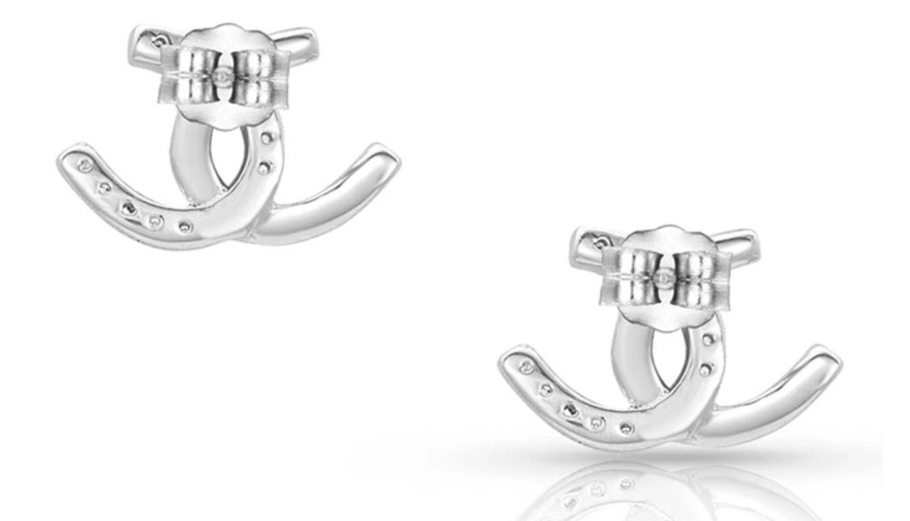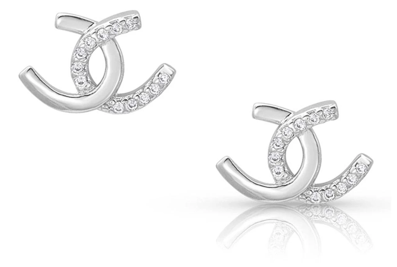 These stud earrings have a double horseshoe shape each tilted to the side. One horseshoe has a smooth bright silver tone that overlays the second clear stone encrusted horseshoe. Earrings have hypoallergenic stainless steel post backs.