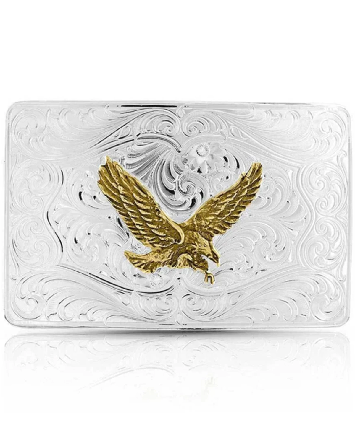 - Rectangular silver-tone buckle with etched filigree accents and center gold-tone eagle design