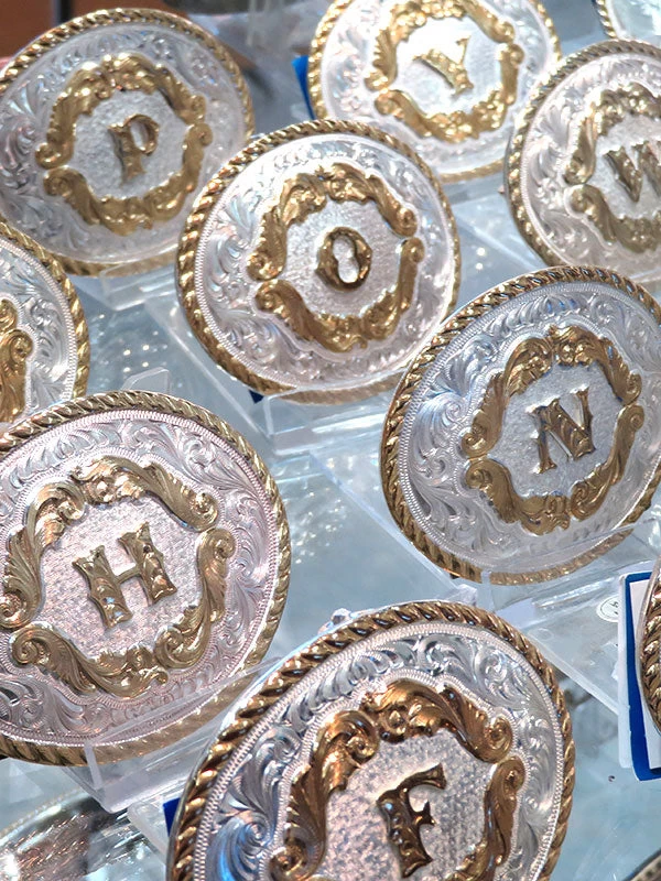Small oval shape belt buckle with a gold twisted rope trim etched around the edge, classic western silver engraving on the buckle with a gold letter inside an applied gold filigree relief.