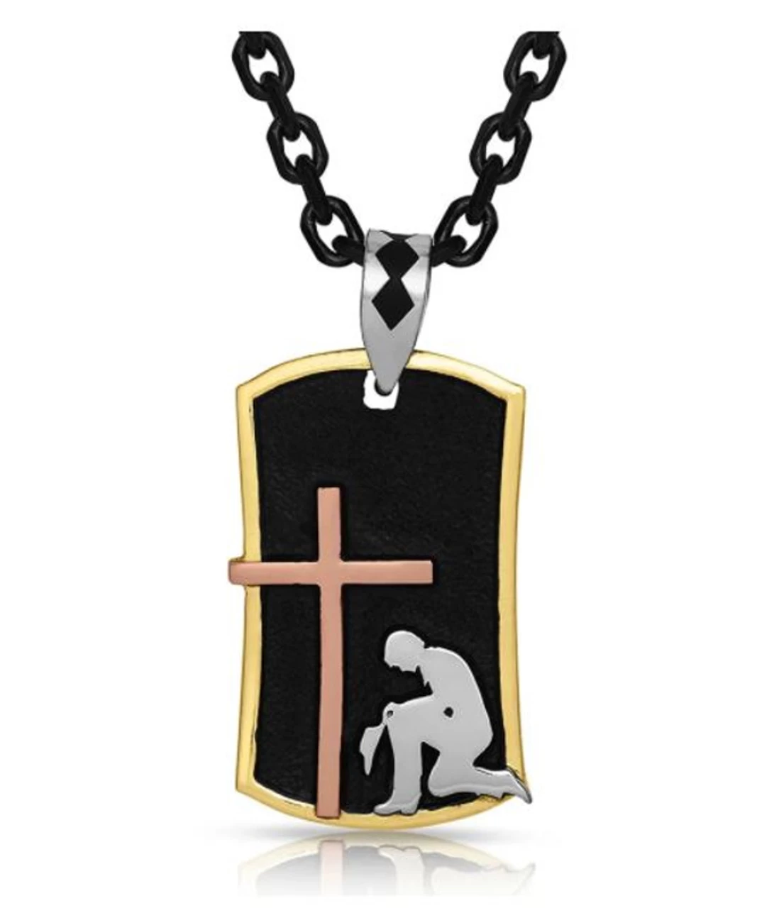 This traditional tri-color dog tag necklace was inspired by the sacrifice made to protect our freedom while also recognizing the faith behind that sacrifice. It is a black dog tag that is trimmed in a gold tone smooth trim. It has a figure of a cowboy kneeling by the cross within itself. It hangs from a 28″ black rhodium chain to sit comfortably on your neck.