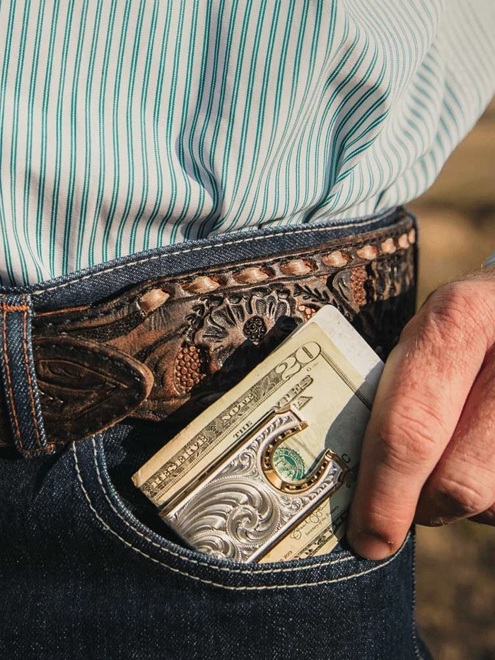 Montana Silversmiths MCL5236 Two-Tone Carved Horseshoe Money Clip Silver – What better way to secure your cash than with a handsome money clip designed to slip easily into a pocket or fit comfortably in your hand? The Two-Tone Carved Horseshoe Money Clip shows off a gleaming two-tone carved horseshoe and classic western filigree to generate interest and create a stunning look appropriate for any occasion.