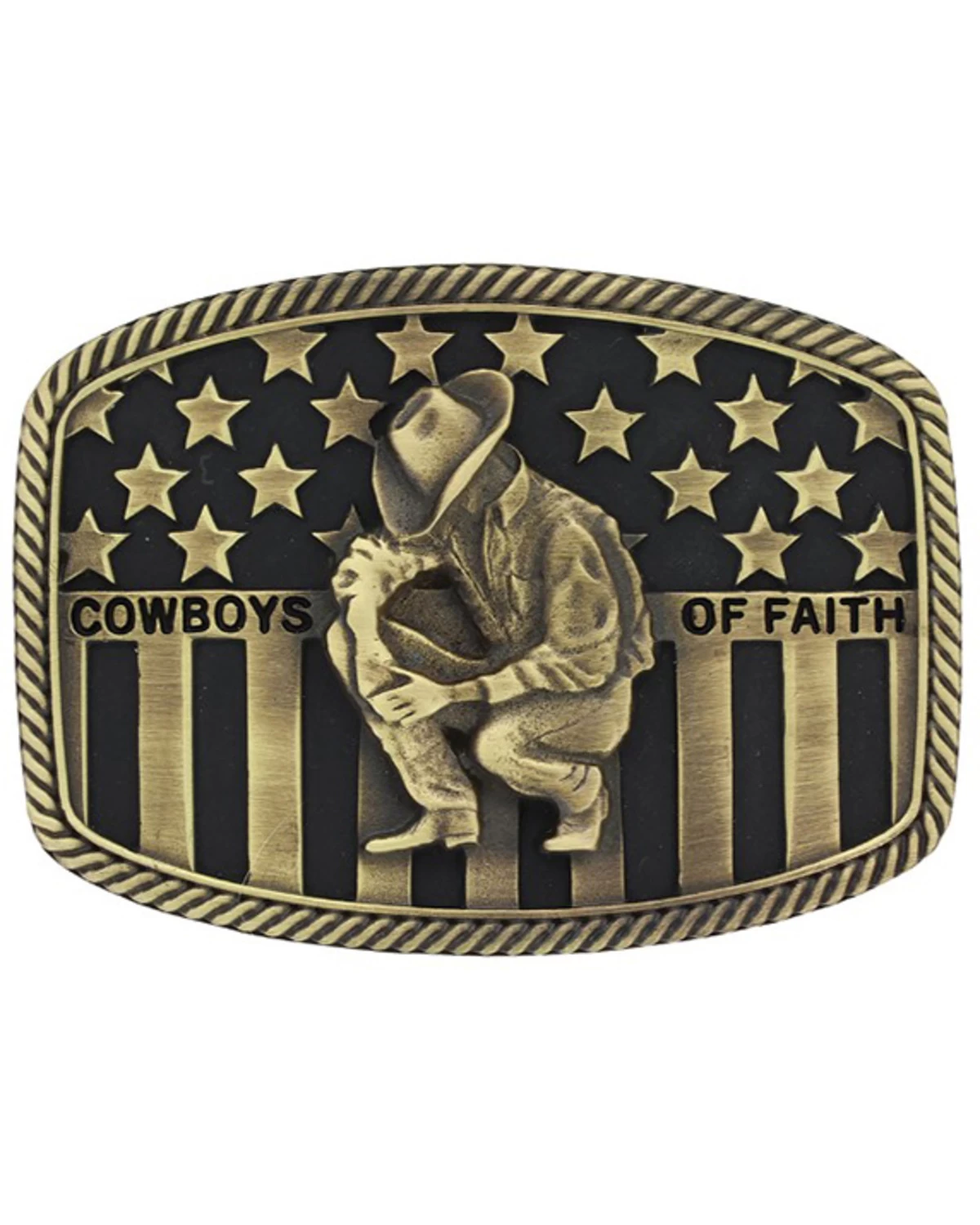 - Antiqued brass Cowboys of Faith figure in front of American flag background with “Cowboys of Faith”