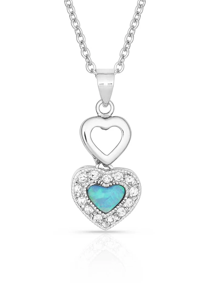Montana Silversmiths NC2537 Womens River Lights in Love Necklace Silver – In the Canyon Colors collection, River Lights pieces echo the dazzling light reflected in the wild rivers and shining in the clear night sky using colored stones set in silver finishes. Featuring a tiny heart shaped pendant, a frame of bright clear rhinestones wrapped warmly around a bright winter blue opal in the center, reflected below a bright silver finish heart loop. Necklace hangs on a princess length 19 inch chain.