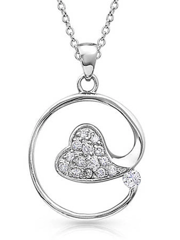 Montana Silversmiths NC4184 Womens Heart And A Hug Necklace – Swooshing Heart Necklace has a center sideways heart encrusted with clear round stones and lined with a smooth wire like frame that runs out and up and around the top of the heart until it comes back around, creating a circle. The end of the circle on the stylish heart necklace is punctuated by a bright clear round stone. This heart necklace pendant also hangs on a princess length 19 in.