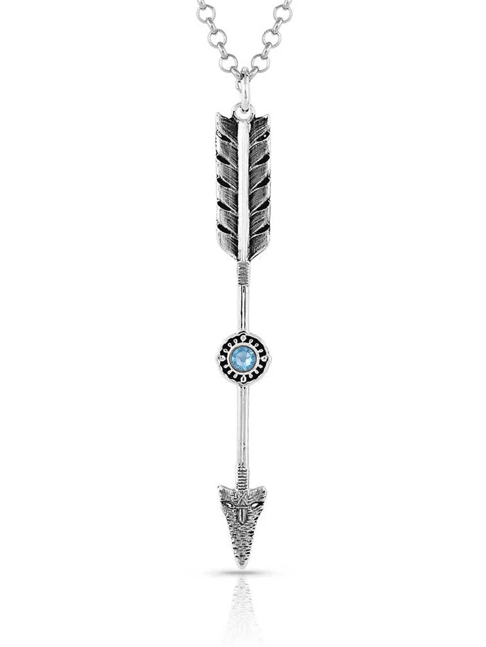 Montana Silversmiths NC4885 Timber Ridge Arrow Necklace Silver- The Timber Ridge Arrow Necklace is stunning and draws exceptional elements from the nature of which it was inspired. It is simplistic and raw, primitive and wild. It is a downward facing arrowhead attached to a spear and hangs from a 28″ chain. The arrowhead is silver-finshed and has markings to enhance it’s natural life-cycle and journey within the wild. In the center, a small circular light blue crystal is placed.