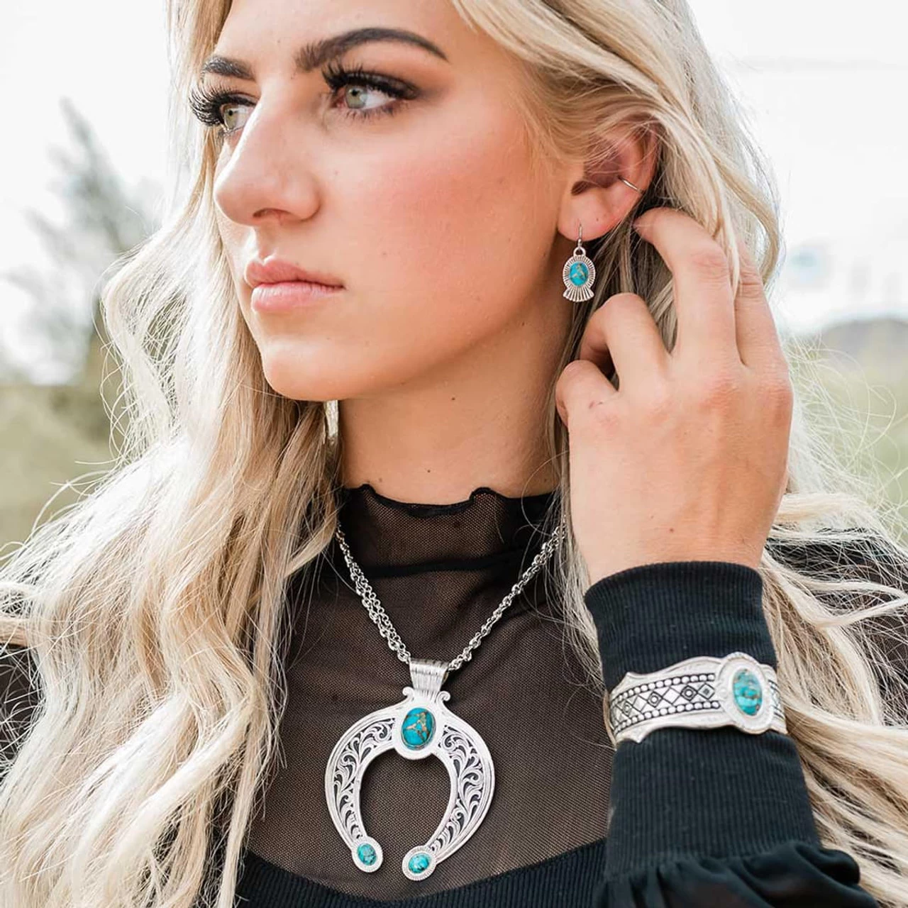 Romantic and western, our Romancing the Stone Squash Blossom is timeless country is appearance. Its all about detail with this piece and our designers have gone out of this world creating a piece with attention to all finest parts of a necklace. It begins hanging from a double 18″ chain. The chain holds a pendant style ring shape that is silver-finished. The top of the ring shape has an oval-shaped turquoise stone that is held in silver-finishes and black filigree on both sides that drape downward. At the bottom of each downward section, an oval-shaped turquoise stone is placed once again. You can’t go wrong with this amazing piece!