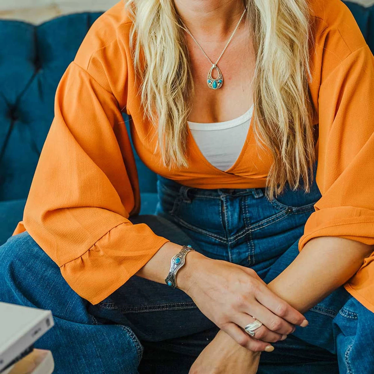 Inspired by primal design, the Seeing Eye Aztec Silver Cuff has a scalloped-shape and is silver-toned. It holds studs that contain bright blue turquoise, roping detail that cradles the turquoise, and blackened etched accents in geometric designs. It is adjustable and one size fits most.