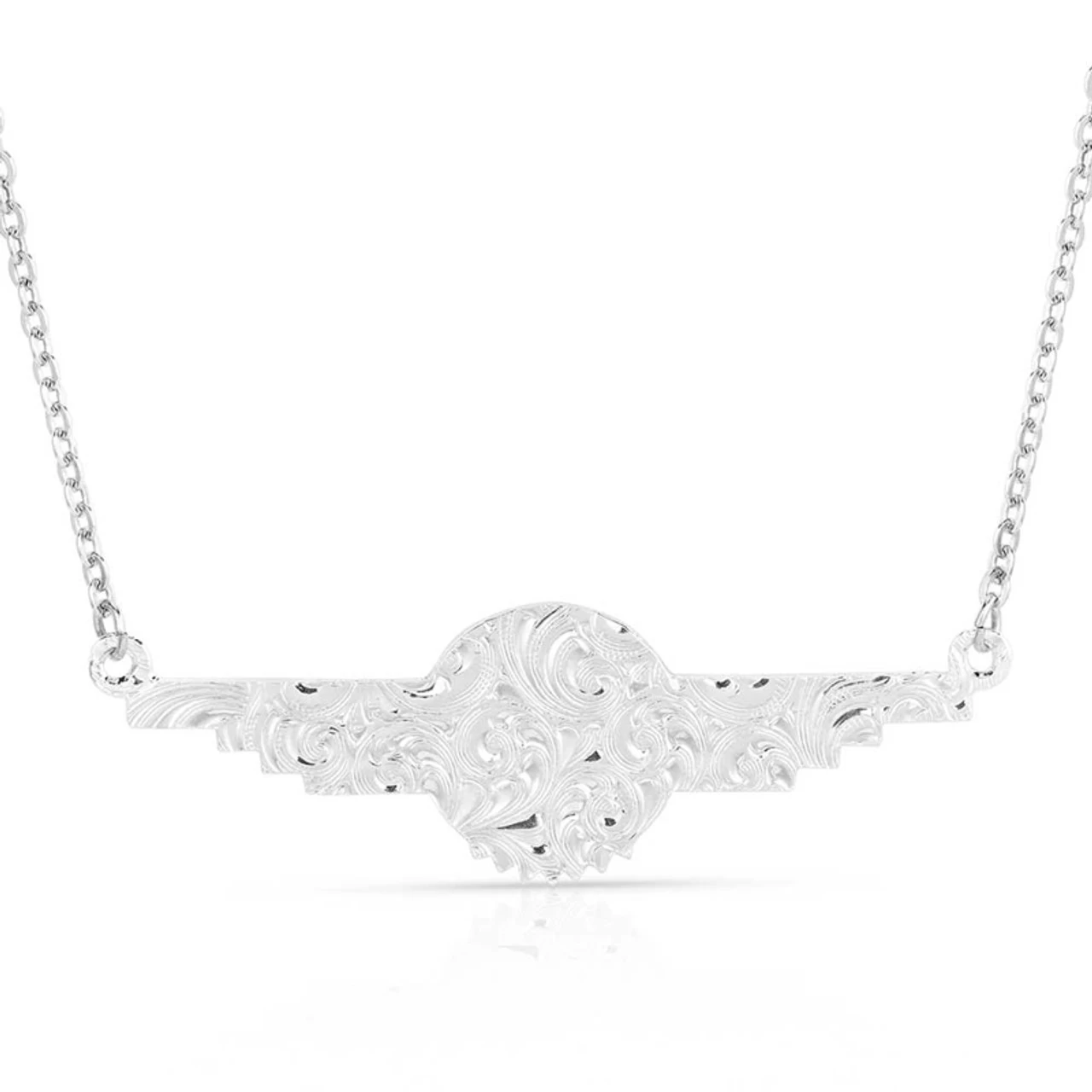 Materials: 99.99% fine silver plated over a brass base. Paint. Montana Armor to prevent tarnish. Rhodium over brass chain.