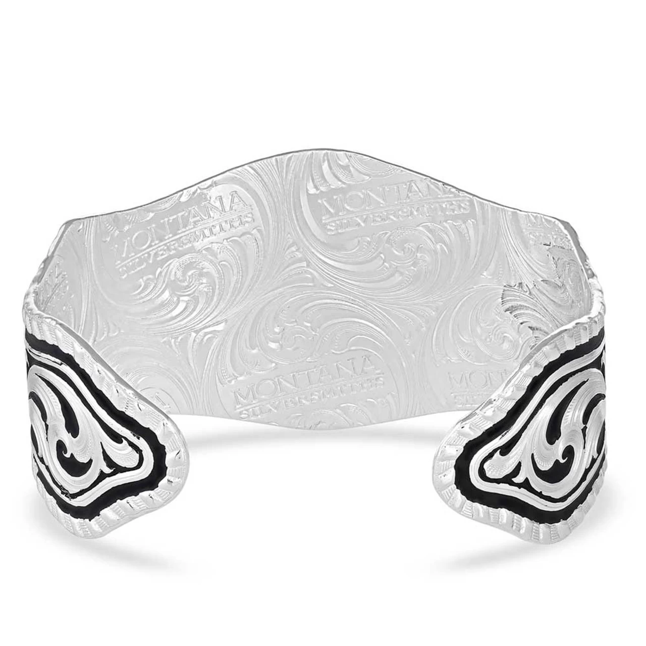 A licensed Paramount TV series Yellowstone filigree cuff bracelet. This bright silver-finished round bracelet has classic, bright-cut engraving flowing throughout the piece and around your wrist. It has an antiqued gold-finished figure of the Yellowstone, Dutton family brand Y in the center circle. Black paint is hand-applied between coins of filigree scrolls to give it contrast. One size fits most.
