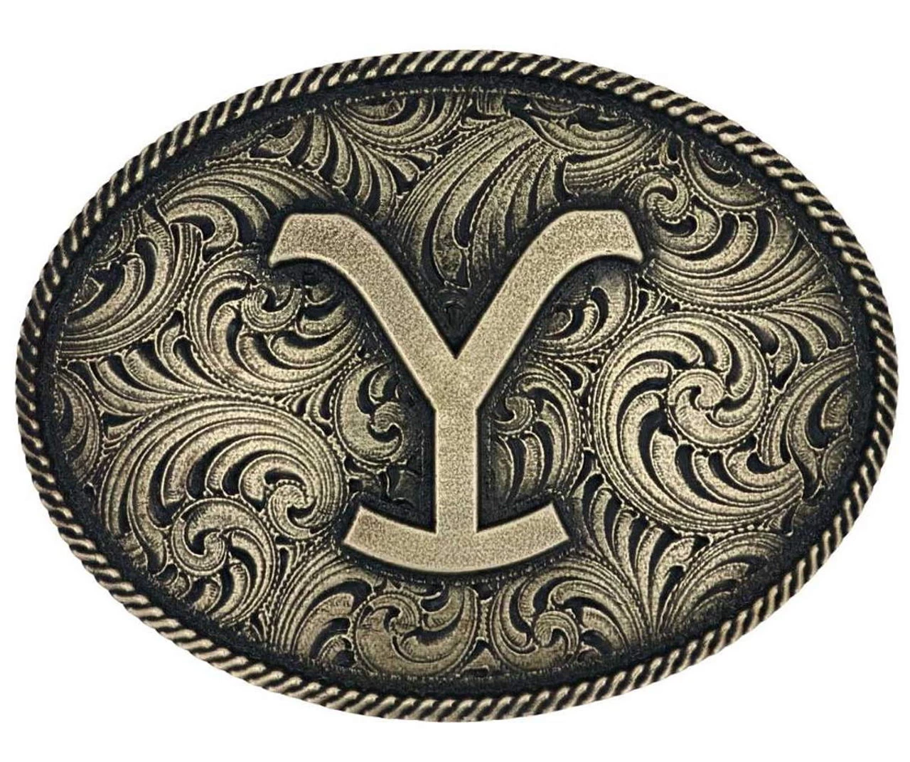 In partnership with Paramount Studios, Montana Silversmiths is proud to design and make Yellowstone-inspired buckles based on the Dutton family in the television series. The Yellowstone Y Filigree Belt Buckle is oval in shape with a gold-finish. The Dutton Family Y brand is placed in the center with ornate filigree surrounding it. This buckle has antiqued black paint for contrast and trimmed in a rope detail. Standard 1.5 inch belt swivel.