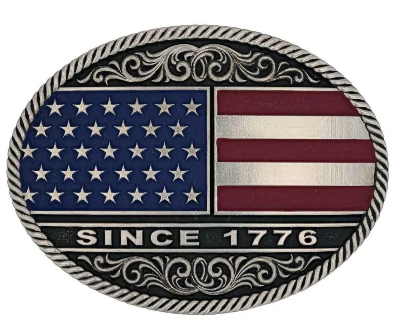 Our Trimmed Circular American Flag Attitude Belt Buckle is an oval shape. The center of it holds an American flag with roping detail as the trim and black painted throughout for added contrast. It has filigree details on the top and bottom. The words “Since 1776” are etched towards the bottom of the buckle. Standard 1.5 inch belt swivel.