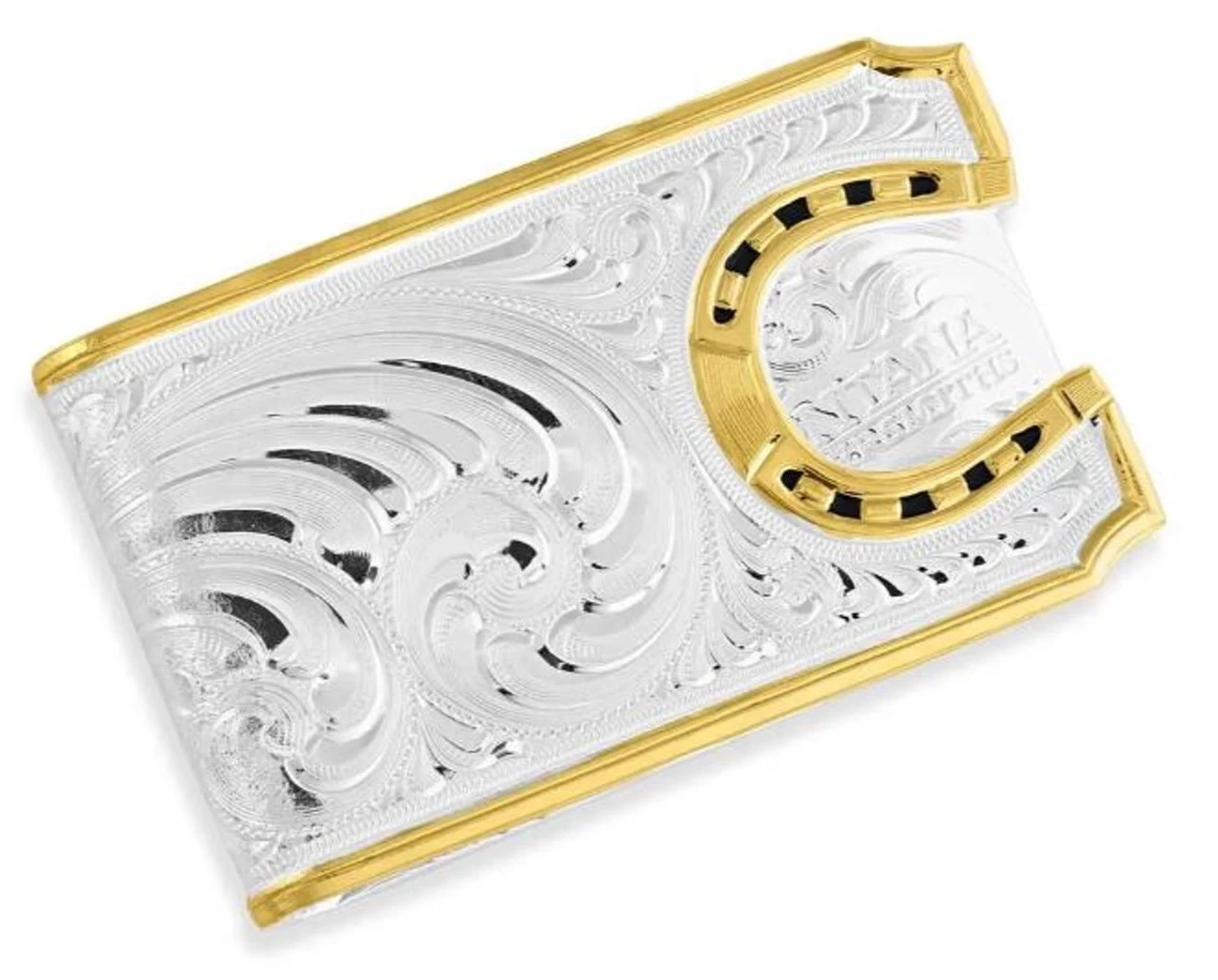 What better way to secure your cash than with a handsome money clip designed to slip easily into a pocket or fit comfortably in your hand? The Two-Tone Carved Horseshoe Money Clip shows off a gleaming two-tone carved horseshoe and classic western filigree to generate interest and create a stunning look appropriate for any occasion.