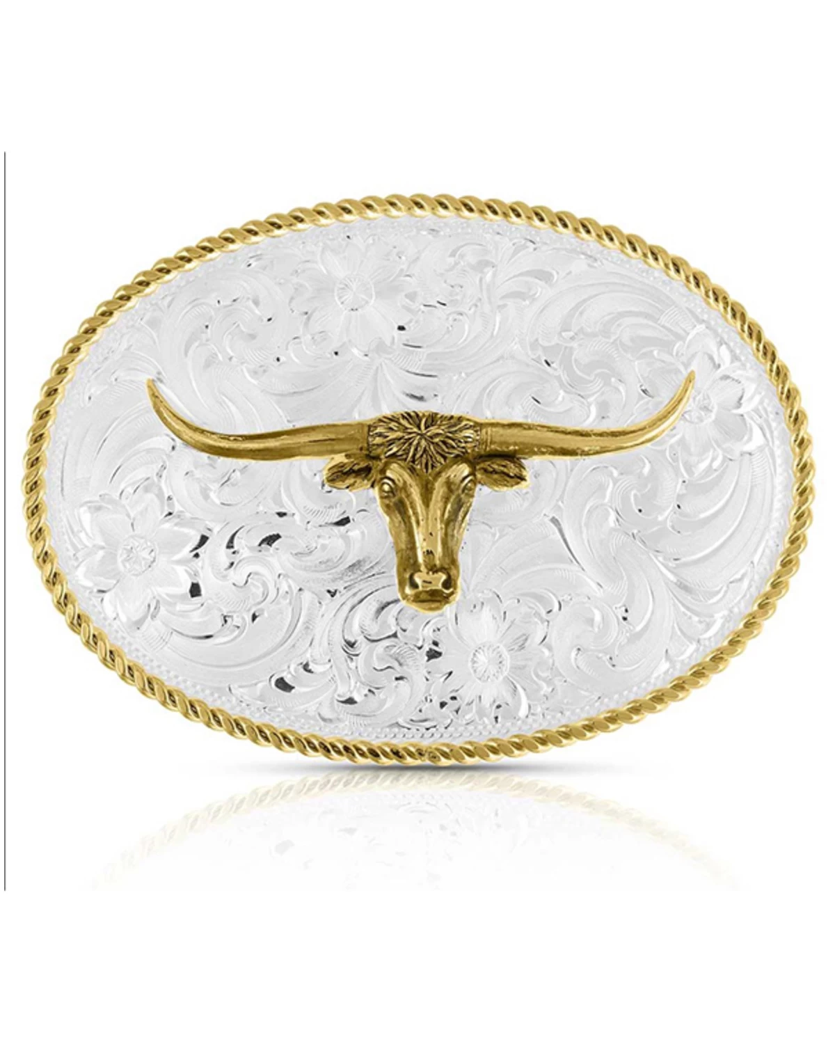- Gold-toned longhorn design at center