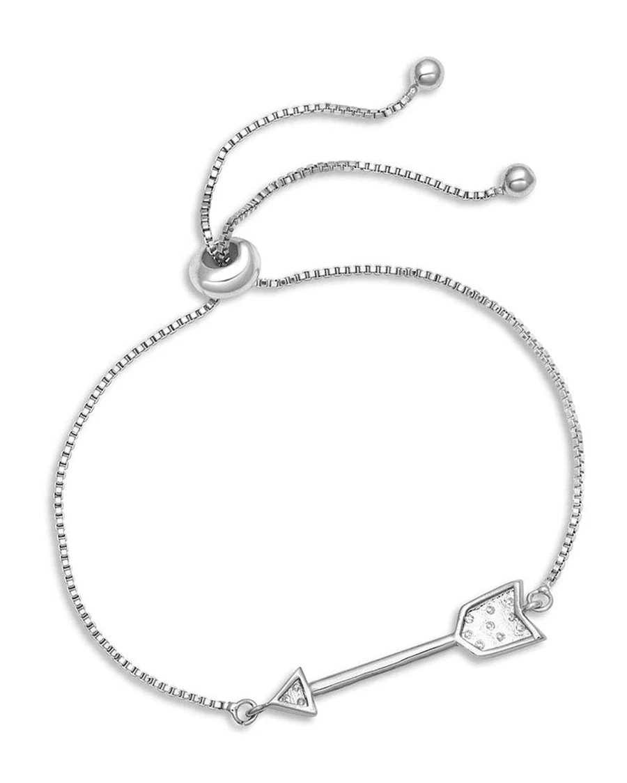 A silver toned arrow pendant bracelet has a slight curve to the arrow