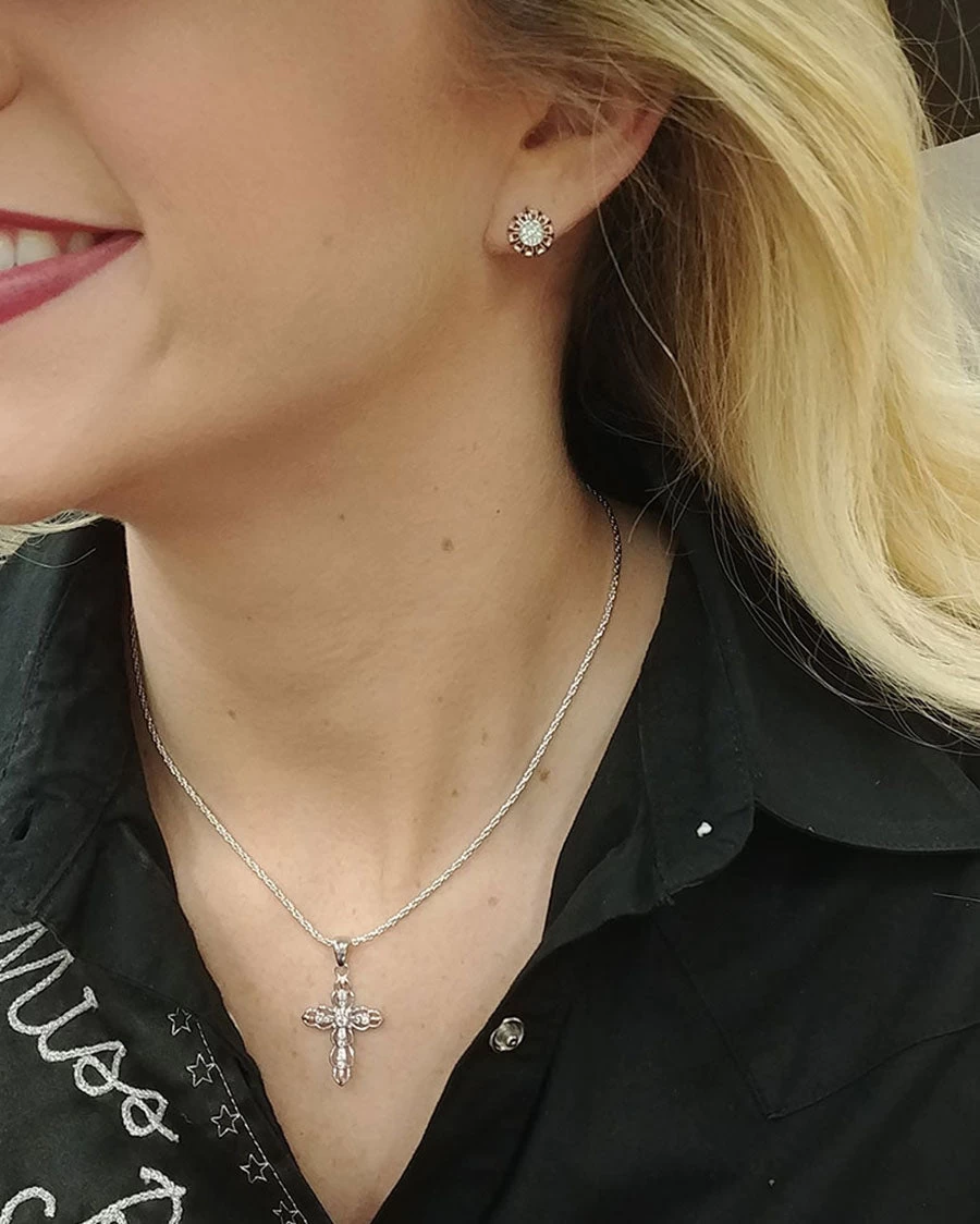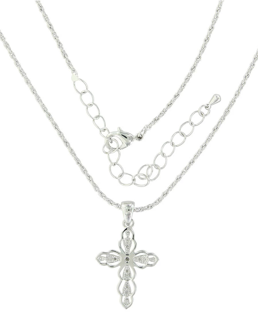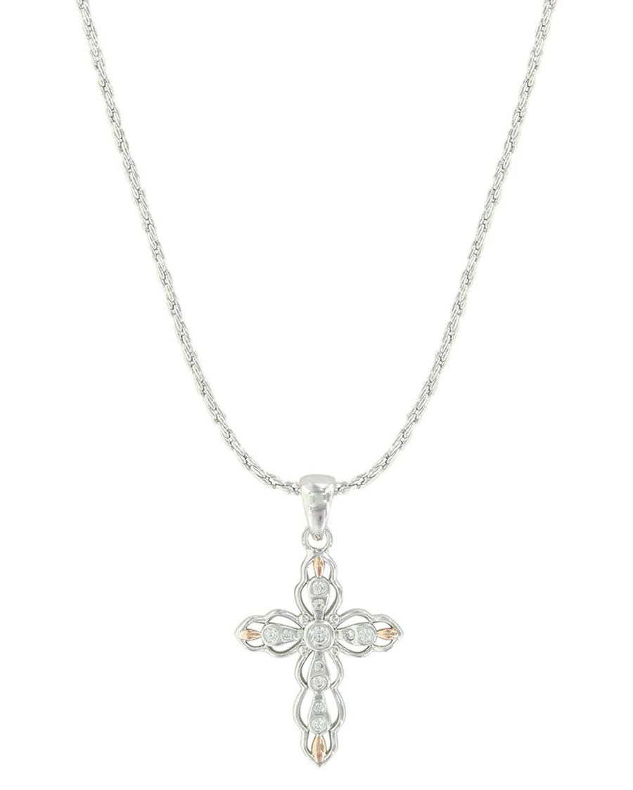 A petite cross shaped necklace of silver and rose gold tones. A center