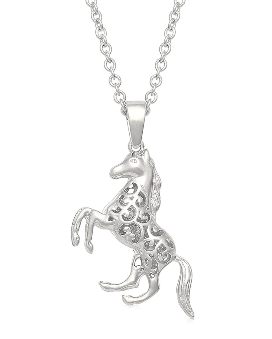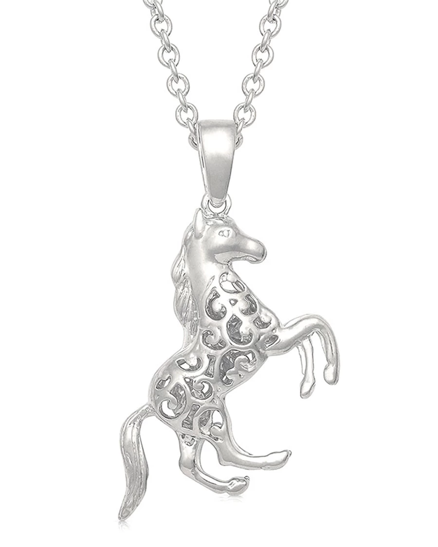 - A horse charm necklace in a silver finish and has filigree cutouts throughout its body. It appears to be rearing up and back while it is suspended from its mane by a 19″ chain.