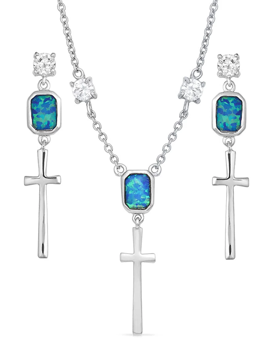 - This jewelry set has earrings that begin with a clear round crystal stud, followed by a square opal gem. Suspended crosses hang from the bottom of the opal, all fastened by a silver finish.