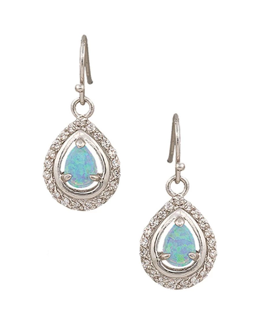 - Petite earrings with center teardrop shaped opal surrounded by a line of clear stones hanging on French hooks. Silver plate over a brass base.