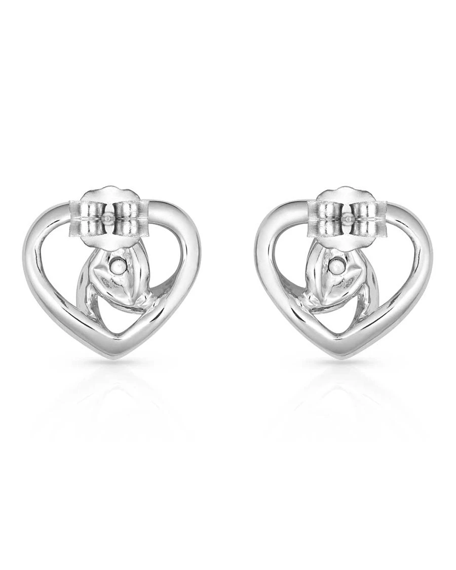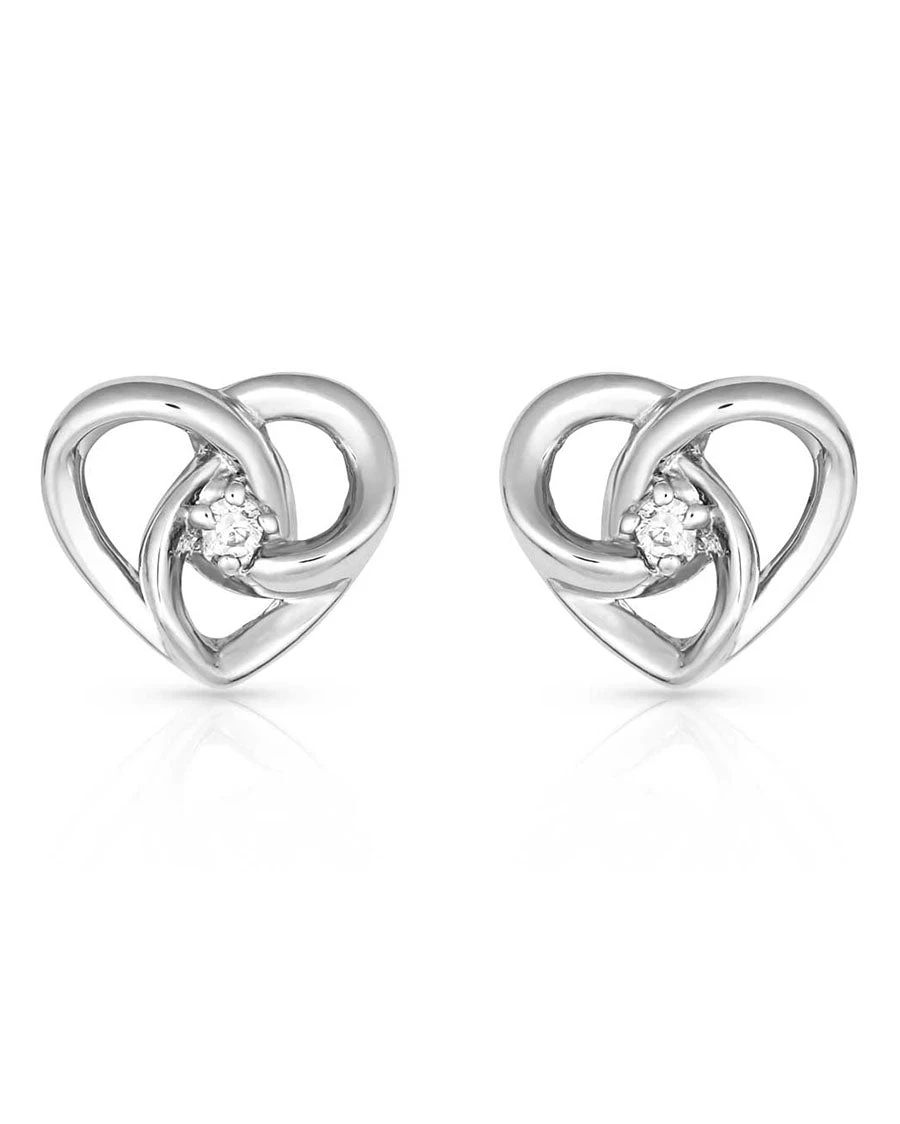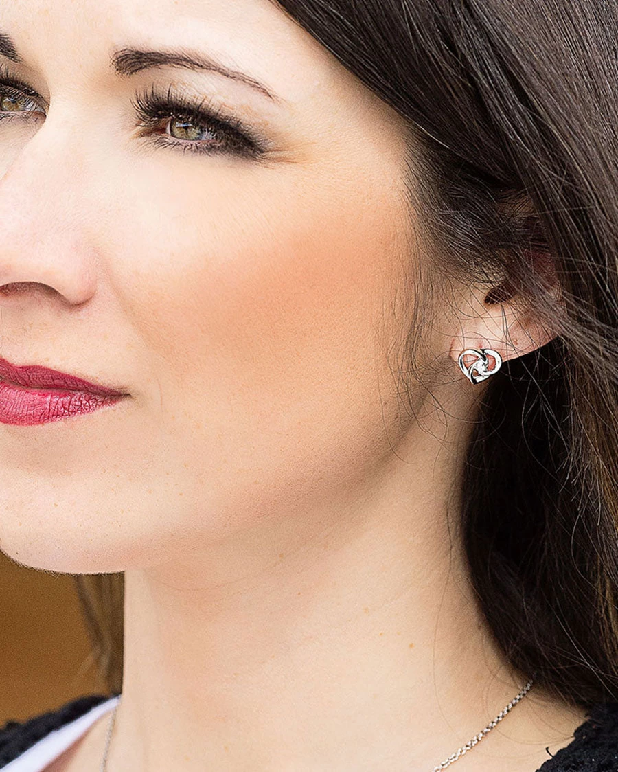stud earrings has an overall heart shape with bright silver tone lines that